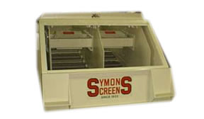 To provide the positive powerful vibration necessary for large screens and big tonnages, two Symons K Vibrators, coupled together are used in each machine. A common center deck construction provides rigid support to the screening surface. Shock resistant rubber mounts enable these heavy-duty units to handle large material normally requiring a double deck screen of conventional design. A full-width feed opening with divider provides distribution of the incoming feed to utilize all of the screening area over the full width of the screening surface.