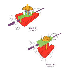A weight (red) is held in balance through a central unit (green), and attached to a cap (orange) by a bolt (yellow). The weight is held close to the central unit by the force exerted by a large coil spring (blue). As power is supplied to the shaft (purple), this entire assembly turns with it. Since the weight is held in balance around the shaft, overthrow during startup is eliminated.